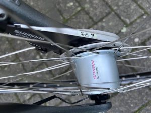 De fiets is uitgerust met een verende voorvork en verende zadelpen, wat zorgt voor extra comfort op ongelijke wegen. De koplamp is strak geïntegreerd in de voorvork en werkt op een naafdynamo, dus je beschikt altijd over goed voorlicht.