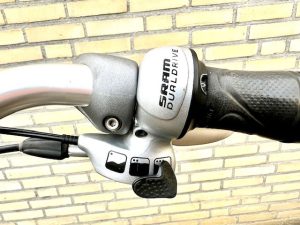 Deze fiets is uitgerust met maar liefst 24 versnellingen dankzij het Sram Dual Drive-systeem – een slimme combinatie van een naafversnelling en derailleur. Hierdoor schakel je soepel en precies, of je nu door de stad fietst of een lange tocht maakt.